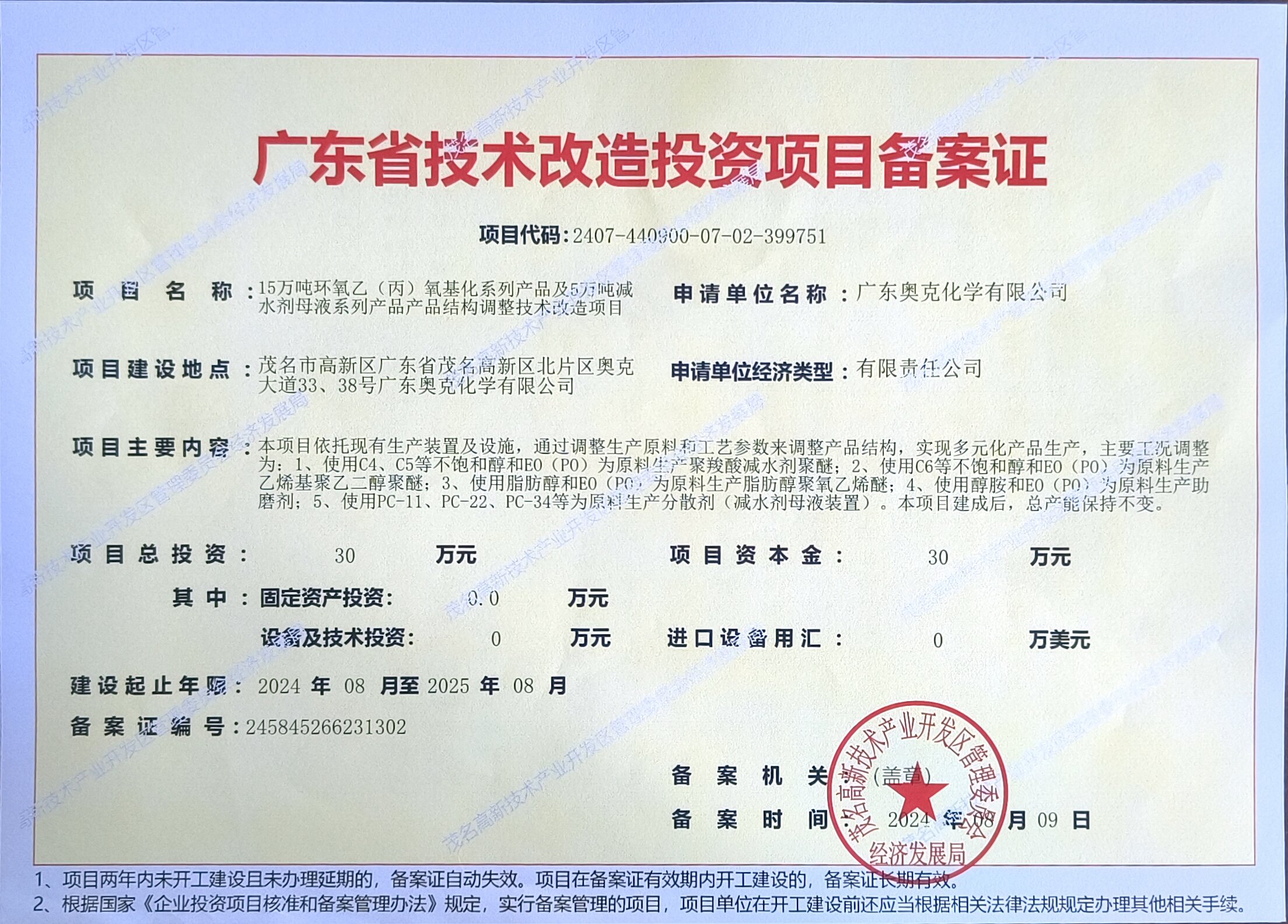 建設(shè)單位名稱:廣東奧克化學(xué)有限公司